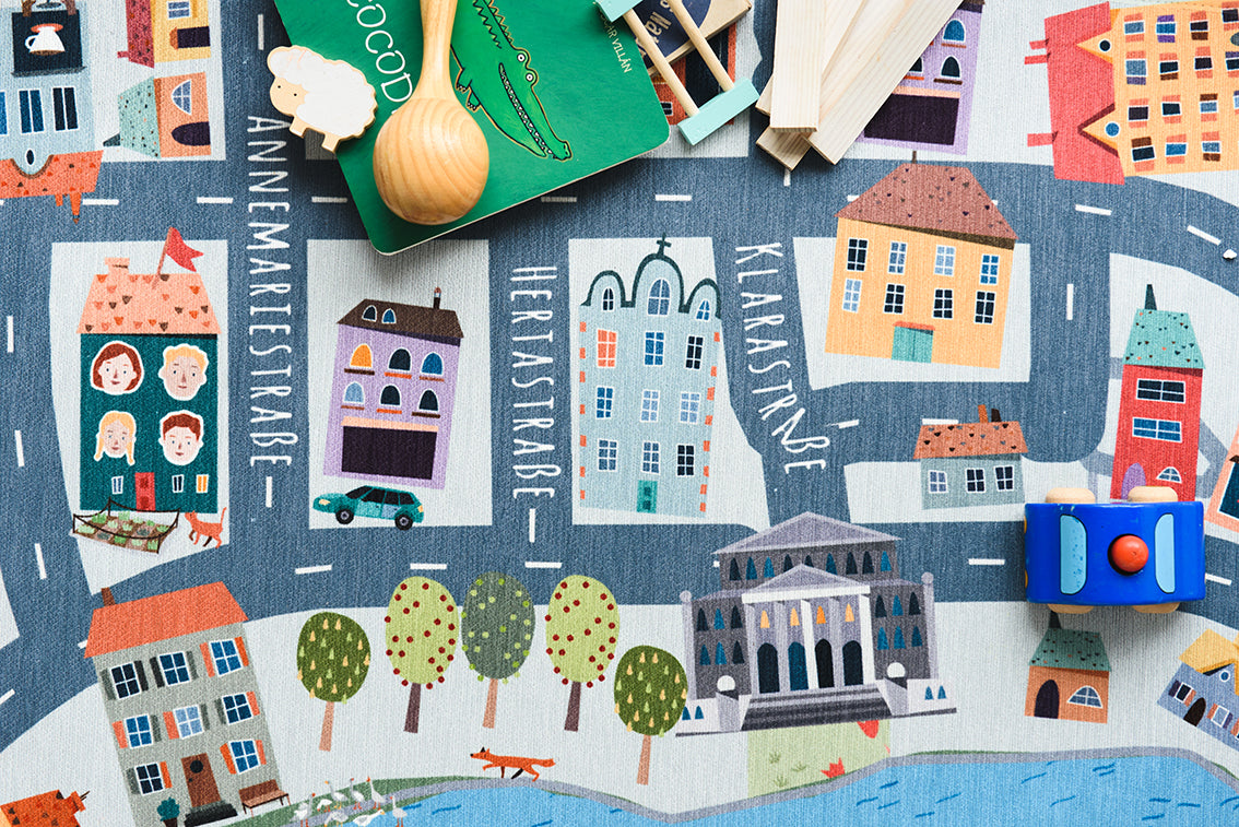 Hallo, ich bin Anna. Teilt mir mit, welche Orte und Dinge Euch in Eurem Kiez wichtig sind und in wenigen Tagen melde ich mich zurück mit einem Vorschlag basierend auf Eurem Input. Das finale Design wird dann als Spielteppich gedruckt und ist in 4-10 Tagen, versandkosten- frei, bei Euch.