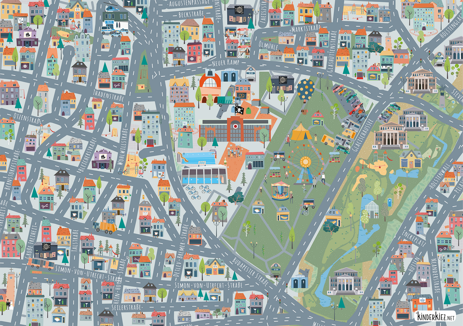 Hallo, ich bin Anna. Teilt mir mit, welche Orte und Dinge Euch in Eurem Kiez wichtig sind und in wenigen Tagen melde ich mich zurück mit einem Vorschlag basierend auf Eurem Input. Das finale Design wird dann als Spielteppich gedruckt und ist in 4-10 Tagen, versandkosten- frei, bei Euch.