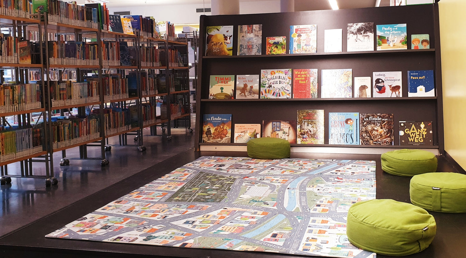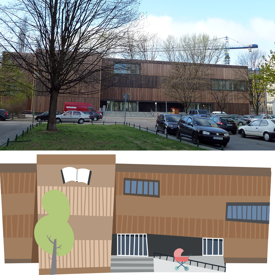 Eine unserer ersten 'Geschäftskundinnen' war die Bezirkszentralbibliothek Pablo Neruda in Berlin Friedrichshain. Das Gebäude mit besonderer Architektur wurde kinderkiez-gerecht visualisiert und dann zusammen mit den Bibliothekar:innen und Erzieher:innen im kinderkiez-Editor in die Nachbarschaft eingebaut.