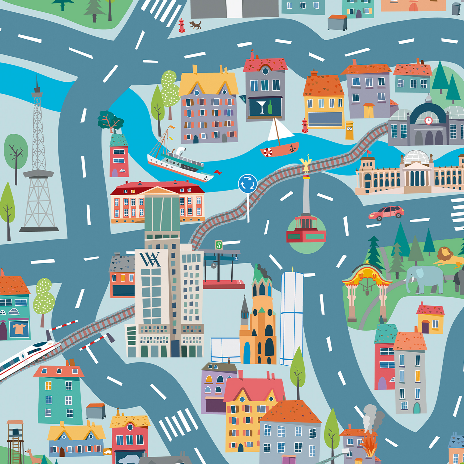 Der kinderkiez Metropolis Berlin Spielteppich ist perfekt für große und kleine Berlin-Besucher:innen. Fand auch das Waldorf Astoria. Aber natürlich darf das eigene Hotel, "das Zoofenster", nicht fehlen. Also haben wir es illustriert und für das Hotel der Hilton-Hotelgruppe eine eigene Metropolis Berlin Edition entworfen.